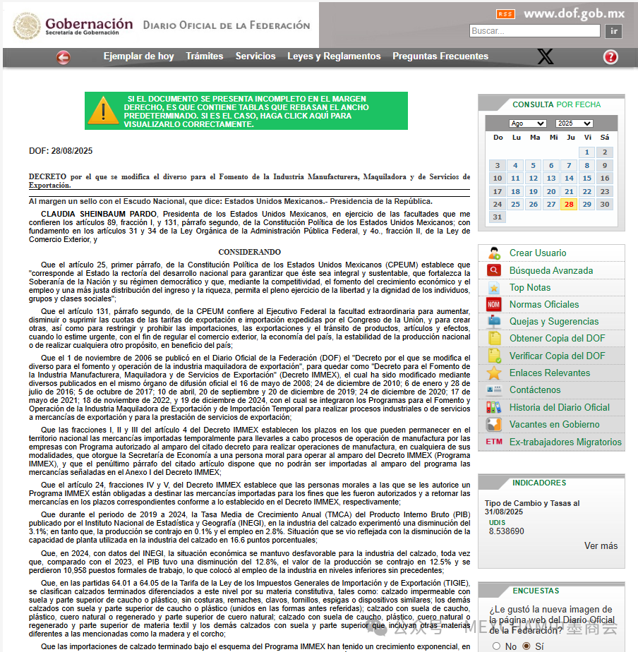 墨西哥政府于2025年8月28日发布了一项法令,刊登在《联邦公报(DOF)上,修改了《促进制造业、加工出口服务行业法令(IMMEX)。主要变化是扩展了附件I,禁止在IMMEX计划下临时进口某些对国内产.....