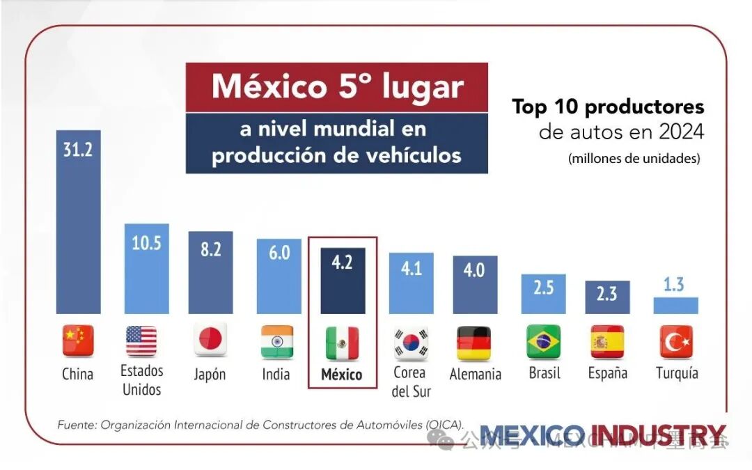 根据国际汽车制造商组织(OICA)的数据,2024年全球车辆生产达到9250万辆。在这一背景下,墨西哥重申了其作为全球汽车强国的地位,位列全球第五,生产了420万辆汽车,超过了韩国和巴西,仅次于中国、.....