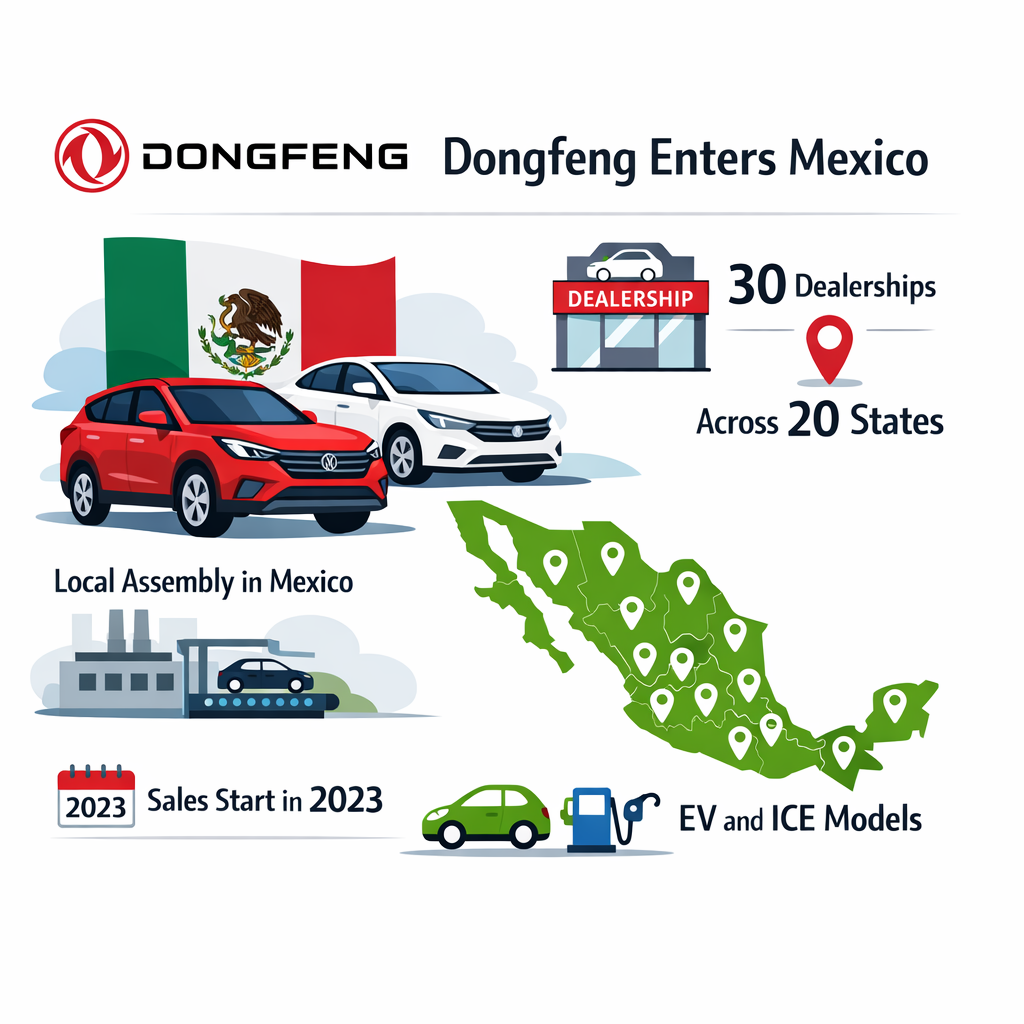 中国第四大汽车制造商东风汽车调整了其在墨西哥的市场进入策略,通过与Motornation的合作,利用其成熟的经销商网络进行车辆分销。该协议使东风汽车能够在墨西哥20个州的30个销售点开展业务,从而充分利用现有的销售和售后服务基础设施。