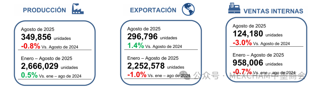 2025 年 8 月底,墨西哥汽车行业的整体情况呈现出生产与出口双稳定的态势,两大领域均达到历史同期较高水平。超 260 万辆的产量与超 220 万辆的出口量,印证了墨西哥作为全球汽车生产平台的地位。