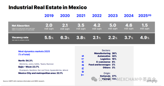 从2019年到2025年第二季度的净吸收量总体呈上升趋势,空置率则有波动。具体来说,从2019年到2023年呈2.0到5.0的稳步上升,到2024年则略有下降到4.6,2025年数据则有待进一步观察。空置率方面,从2019年到2024年呈上升下降再上升的趋势,到2025年第2季度已经有上升趋势了。关于2025年的金融市场情况,墨西哥北方占总额大半部分即54.3%,Bajío – West占23.7%,墨西哥城及周边地区则占22.1%。关于租户部分,各行业占比情况:制造业占36%,汽车业占32%,物流占19%,电子商务占8%,食品和饮料2%其他则2%;来源占比情况则是大部分来自国外占73%,剩下27%是国内。