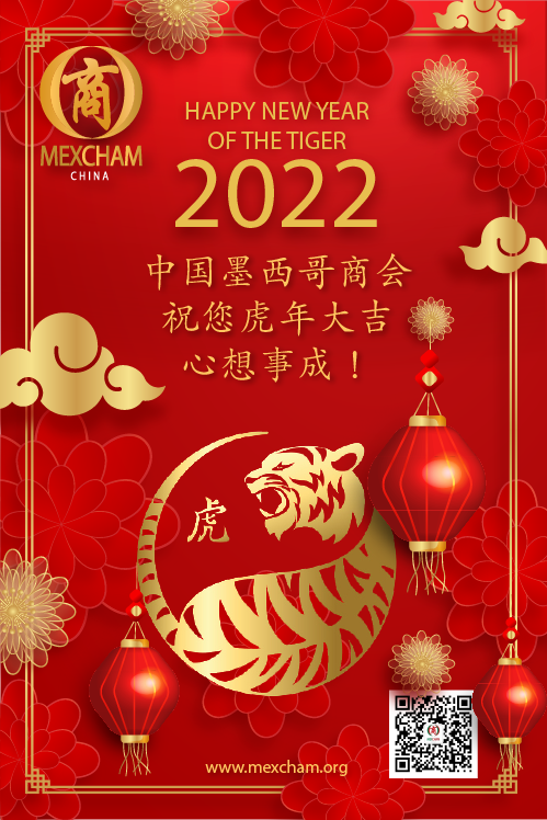 親愛的朋友們、會員們: 中国墨西哥商会(MEXCHAM)祝福您在2022壬寅虎年身體健康!財運亨通!虎虎生威!如虎添翼!萬事如意! 中国墨西哥商会将继续作为墨西哥与中国之间的桥梁,不断努力。 Cáma.....