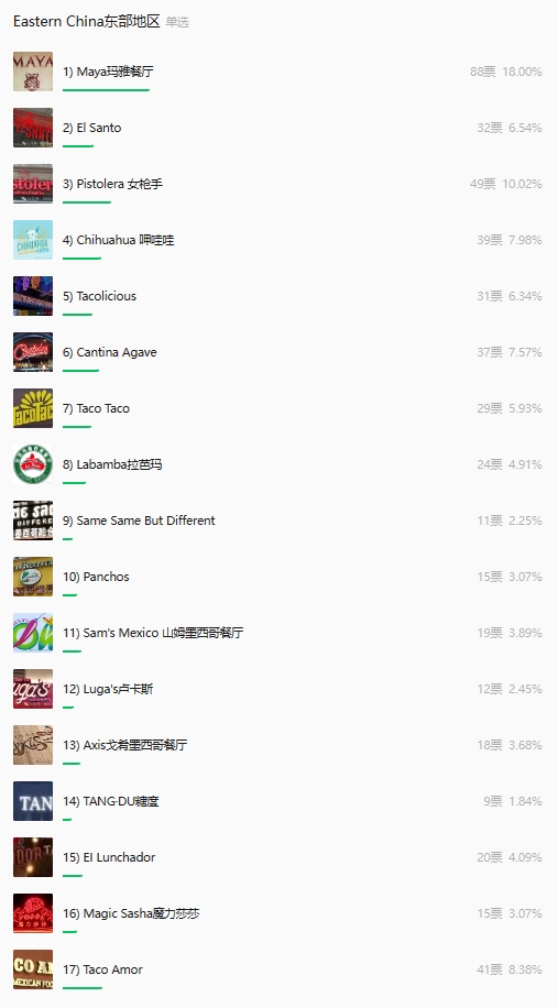 华东地区最受欢迎的是Maya玛雅餐厅,得票率为 18%。
