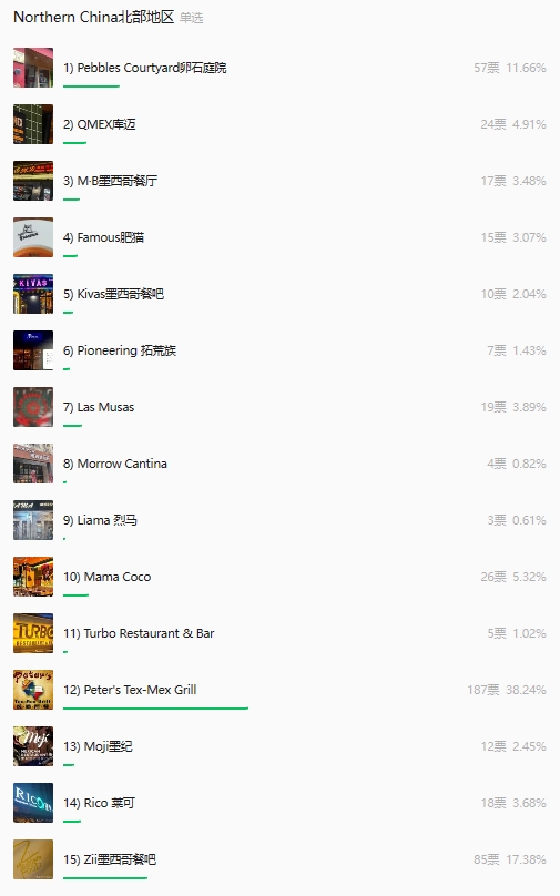 华北地区最受欢迎的墨西哥餐厅是 Peter’s Tex-Mex Grill,得票率为 38.24%。