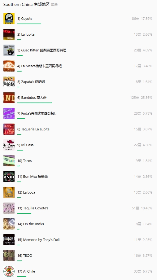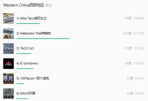 中国西部最受欢迎的墨西哥餐厅是 Habanero Tree 柿椒树,得票率为 41.72%。