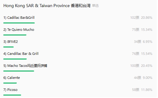 最后,在香港特别行政区和台湾省组别中,Cadillac Bar & Grill 以 20.86% 的得票率胜出。