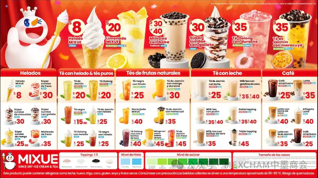 中国品牌蜜雪冰城将带着其品牌理念进军墨西哥市场,甚至连价格也体现了这一点。根据社交媒体上的帖子,这些产品价格相当实惠,产品种类和口味丰富多样。