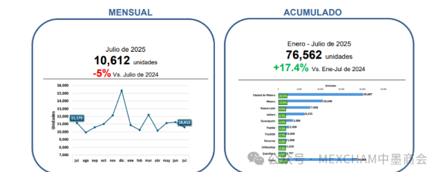 2025 年 1-7 月,清洁能源汽车销量累计达 76,562 辆,较去年同期增长 17.4%,占全国总销量的 9.2%,这巩固了墨西哥作为对可持续出行方式日益接纳的市场地位。