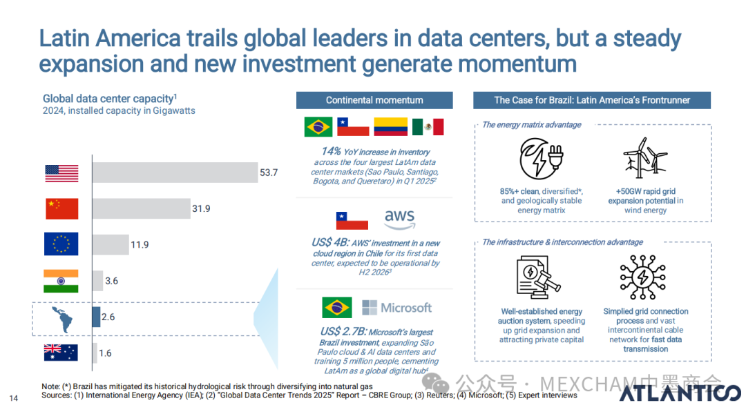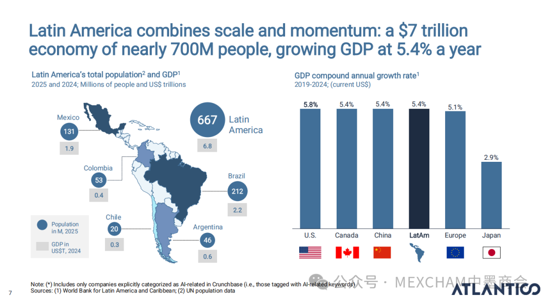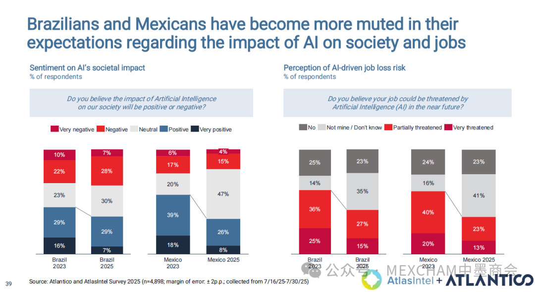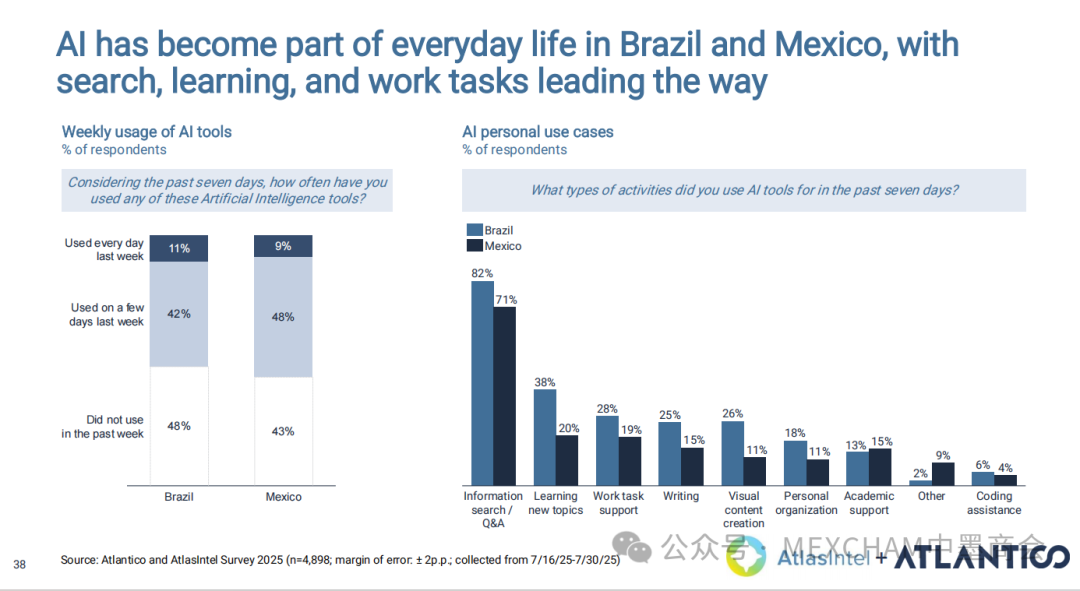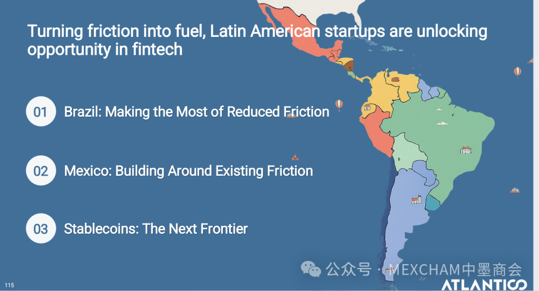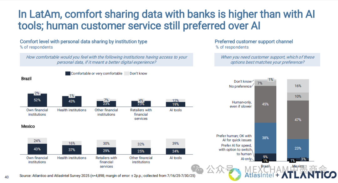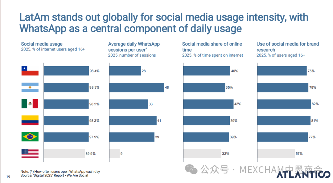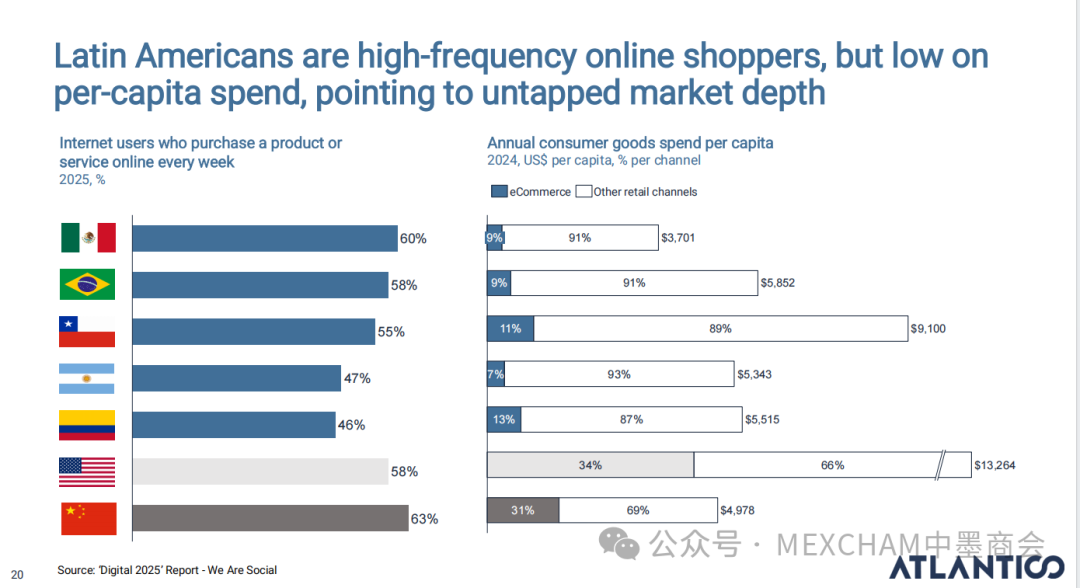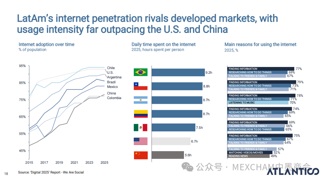 拉丁美洲的互联网普及率可与发达市场比肩,使用强度远超美国和中国。其中,墨西哥互联网普及率近十年逐年攀升,人均每天上网时间为7.5小时。拉丁美洲在全球社交媒体使用强度方面表现突出,WhatsApp是日常使用中的核心组成部分。下图从左至右分别为社交媒体使用、平均每日WhatsApp会话次数、社交媒体在网络使用时间中的占比和利用社交媒体进行品牌研究。拉丁美洲人虽是高频网购群体,但人均消费水平较低,这表明市场潜力尚未充分挖掘。其中,墨西哥每周在线购买产品或服务的互联网用户占比为60%,而人均年度消费品支出在互联网购物则占比9%。03人工智能能源供应充足、可再生能源电网覆盖以及有利政策有望使拉丁美洲成为全球数据中心枢纽。人工智能已成为巴西和墨西哥日常生活的一部分,其中搜索、学习和工作任务引领着这一趋势。墨西哥人每天使用AI工具的人口占9%,一周使用多次占48%,不使用则占比43%。巴西人和墨西哥人对人工智能对社会和就业的影响预期已趋于谨慎。在拉丁美洲,人们更愿意与银行共享数据而非人工智能工具;人工客服仍比人工智能更受欢迎。中小企业是拉丁美洲经济的支柱,其生产力的提升有望释放逾1000亿美元的价值创造潜力。04财务人力资本拉丁美洲风险投资数据显示,当地基金正适度转向早期融资轮次,墨西哥在该领域的份额近期有所增长。拉丁美洲创业者可获得大量商业岗位人才,但在人工智能和产品岗位招聘方面面临人才短缺。05医疗保健拉丁美洲承诺实现全民医疗保障,但实施情况参差不齐,投资有限且健康成果落后于同类地区。医疗支出越高,医疗效果越好,但医疗体系的效率才是最终区分顶尖机构的关键因素。06金融科技将摩擦转化为燃料,拉丁美洲初创企业正释放金融科技领域的机遇。其中,墨西哥将围绕现有摩擦点进行建设。墨西哥是全球最大的汇款市场,使汇款成为其最成功的数字银行应用案例。完整报告请点击下方链接 Click below to read the complete report.