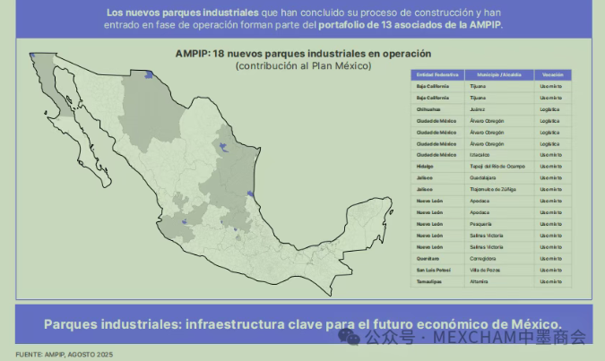 这18个新园区分布于包括下加利福尼亚州、新莱昂州、哈利斯科州、瓜纳华托州和墨西哥州在内的重点地区。每个园区都因其交通便利和产业潜力而被选中。特别值得注意的是,蒂华纳、华雷斯市、蒙特雷和托卢卡等城市正成为推动墨西哥工业转型的重要据点。