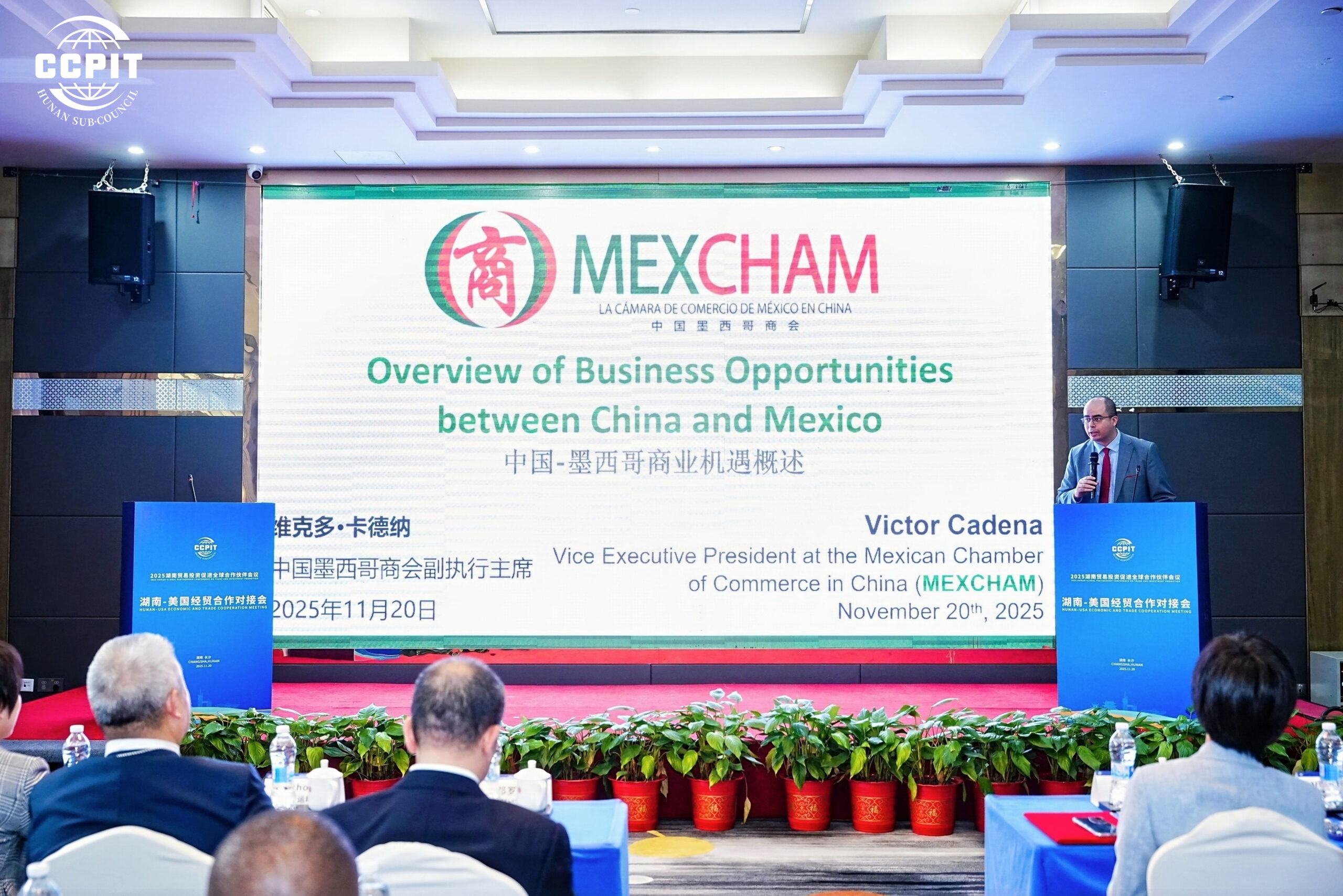 On November 20, 2025, Hunan Global Partnership Conference on Trade and Investment Promotion, hosted by China Council for the Promotion of International Trade (CCPIT) Hunan Sub-council, was held in Changsha, Hunan. More than 500 participants attended the event, including government representatives, diplomatic envoys to China, leaders of business associations, and entrepreneurs from over 30 countries and regions. 。During the opening ceremony, Yang Aiyun, Chairwoman of the China Council for the Promotion of International Trade (CCPIT) Hunan Sub-Council, announced the commencement of the meeting.Zhang Jian, Vice Chairman of the Committee of the Chinese People’s Political Consultative Conference Hunan Provincial Committee and Chairman of the Hunan Federation of Industry and Commerce, delivered a keynote speech. During the conference, different Matchmaking Meeting Session were held. In North America Matchmaking Session, Deng Luoxing, Vice Chairman of the CCPIT Hunan Sub-Council, delivered remarks. During the promotion session, Victor Cadena, Executive Vice President of the Mexican Chamber of Commerce in China (MEXCHAM), presented a review of business opportunities between China and Mexico.MEXCHAM continues building bridges between Mexico and China.