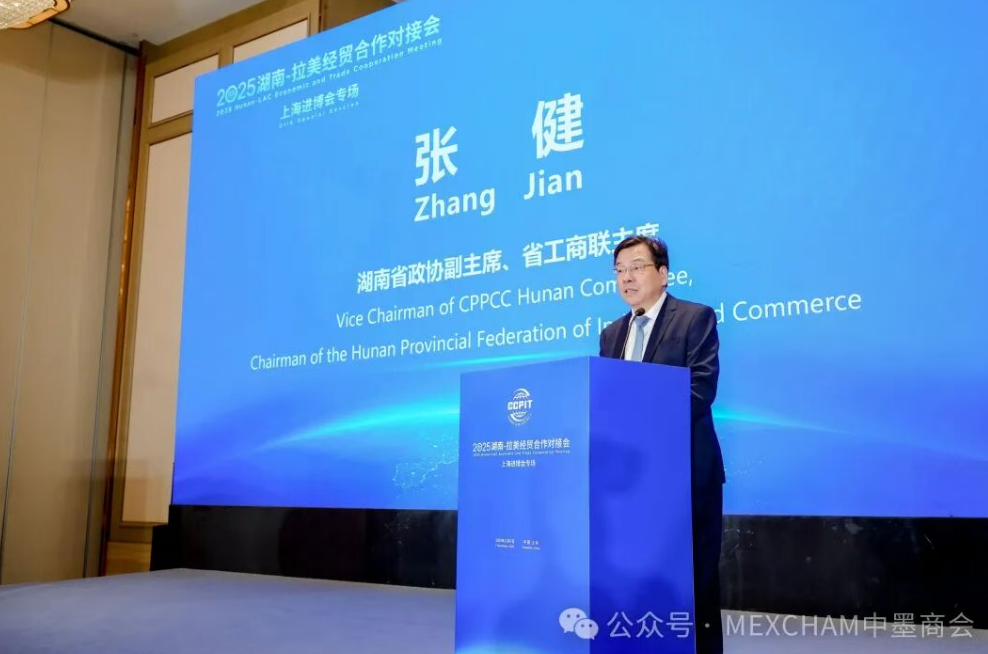 On November 7, 2025, the Hunan-LAC Economic and Trade Cooperation Meeting was held in Shanghai. The meeting was organized by the CPPCC Hunan Committee and CCPIT Hunan Sub-council, with participation from Mr. Zhang Jian, Vice Chairman of the CPPCC Hunan Committee and Chairman of the Hunan Provincial Federation of Industry and Commerce, among others.